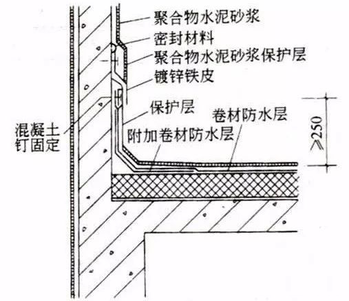5)突出屋面的上人孔、烟囱、管道、变形缝、高低跨,女儿墙根部必须做好凹面弧,不得出现直角。泛水高度不得小于250mm,防水材料要埋入凹槽内固定密封,墙体为砼时,收头可用金属压条钉压牢固,凹槽抹灰时,要预先抹1-2次厚与女儿墙立面抹灰一次成活,抹到凹槽下平,不得先抹女儿墙灰,再抹堵凹槽灰,以免形成水平裂缝。突出层面的管根部位防水材料高度不宜小于250mm,封口处要用金属箍固定,变形缝包括伸缩缝、沉降缝和抗震缝,三者做法基本相同,装饰前要认真清理变形缝内的杂物,清理感觉后,变形缝内宜填充泡沫塑料或沥青麻丝,并用防水材料封盖,顶部加扣混凝土盖板或金属盖板,金属盖板加工时咬口,并充分考虑变形缝的大小留置变形补偿。